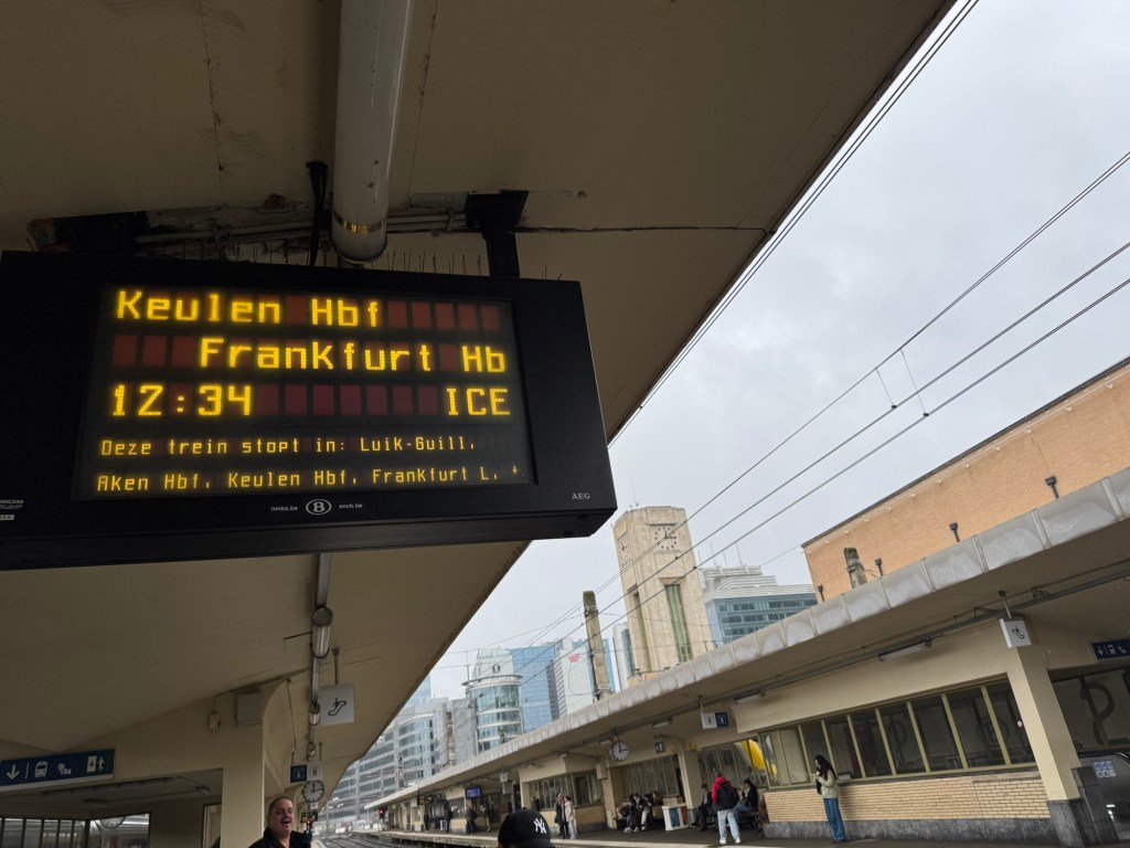 I checked the notice board for the train to Cologne. Spotted that there was an issue, it looked like the train was delayed and was leaving from a different station, Brussels-Nord. I confirmed this, and was told what train to catch.