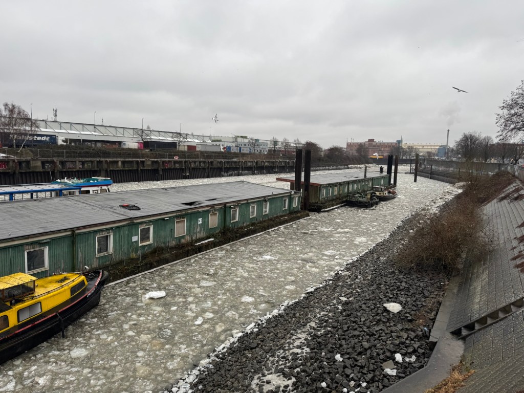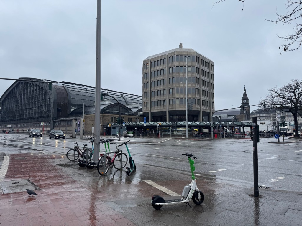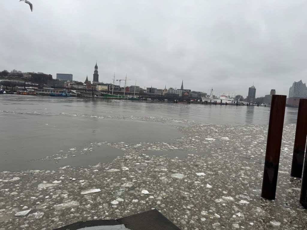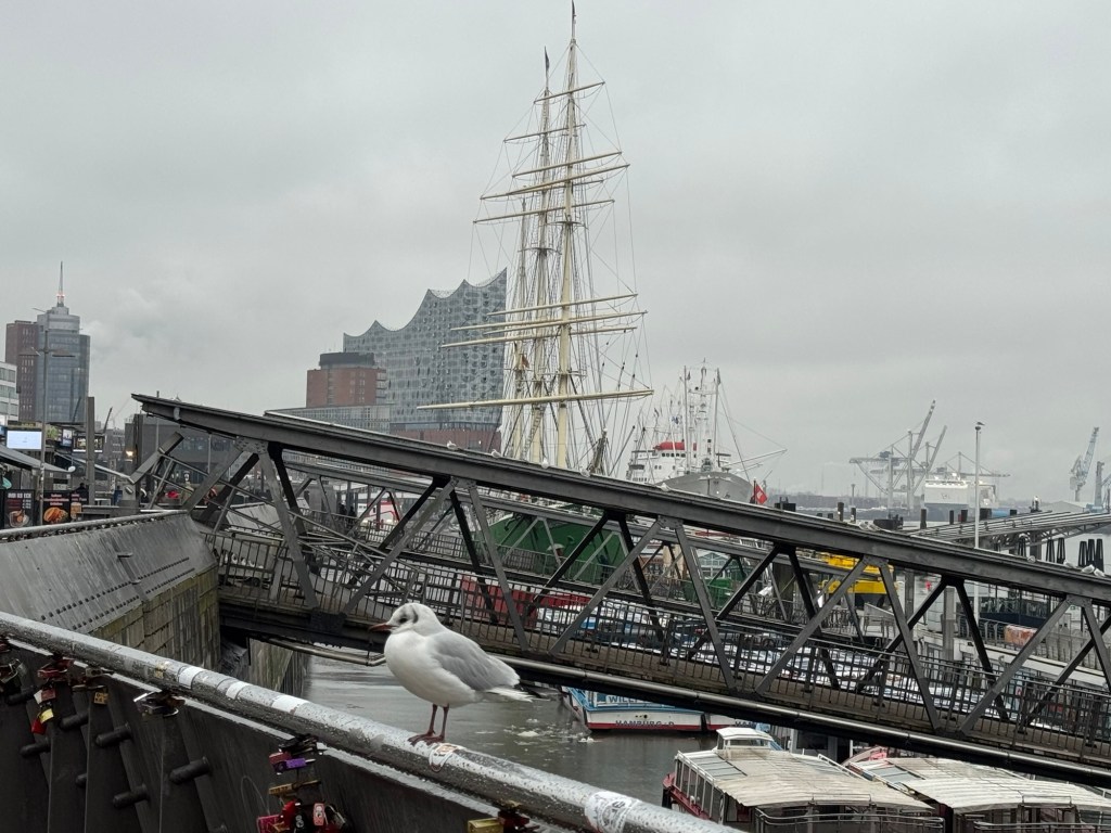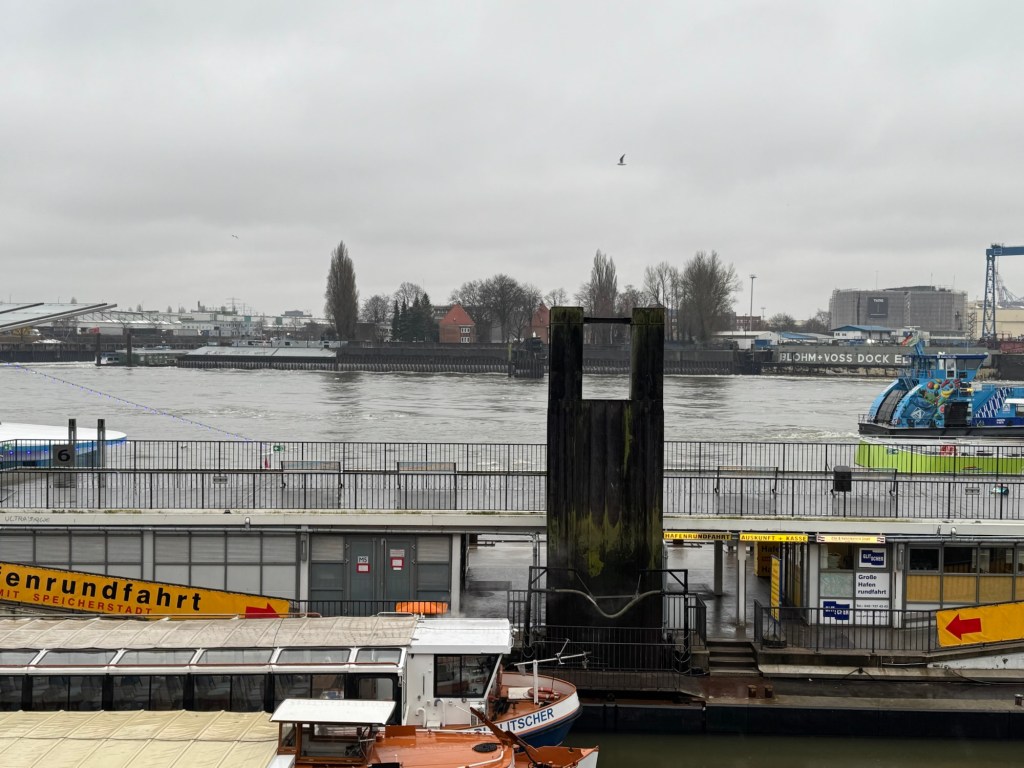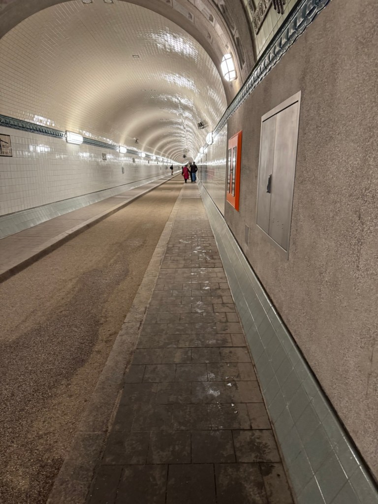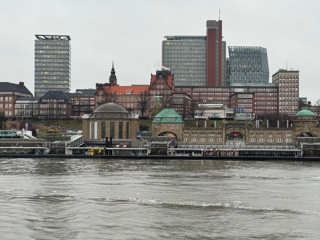 Landungsbrücken and the entrance to the tunnel on the other side of the Elbe.